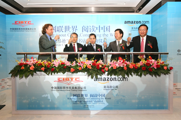 2011年9月29日,國圖集團公司和美國亞馬遜公司在北京王府井希爾頓酒店隆重舉行亞馬遜“中國書店”項目啟動儀式。國家新聞出版總署署長柳斌杰、副署長鄔書林,中國外文局局長周明偉等出席儀式。中央外宣辦三局局長張雁彬,新聞出版總署對外交流與合作司司長張福海,外文局常務副局長郭曉勇、副局長陸彩榮,新聞出版總署對外交流與合作司副司長陳英明,海關總署數(shù)據(jù)中心副總工程師陳輝等參加啟動儀式。