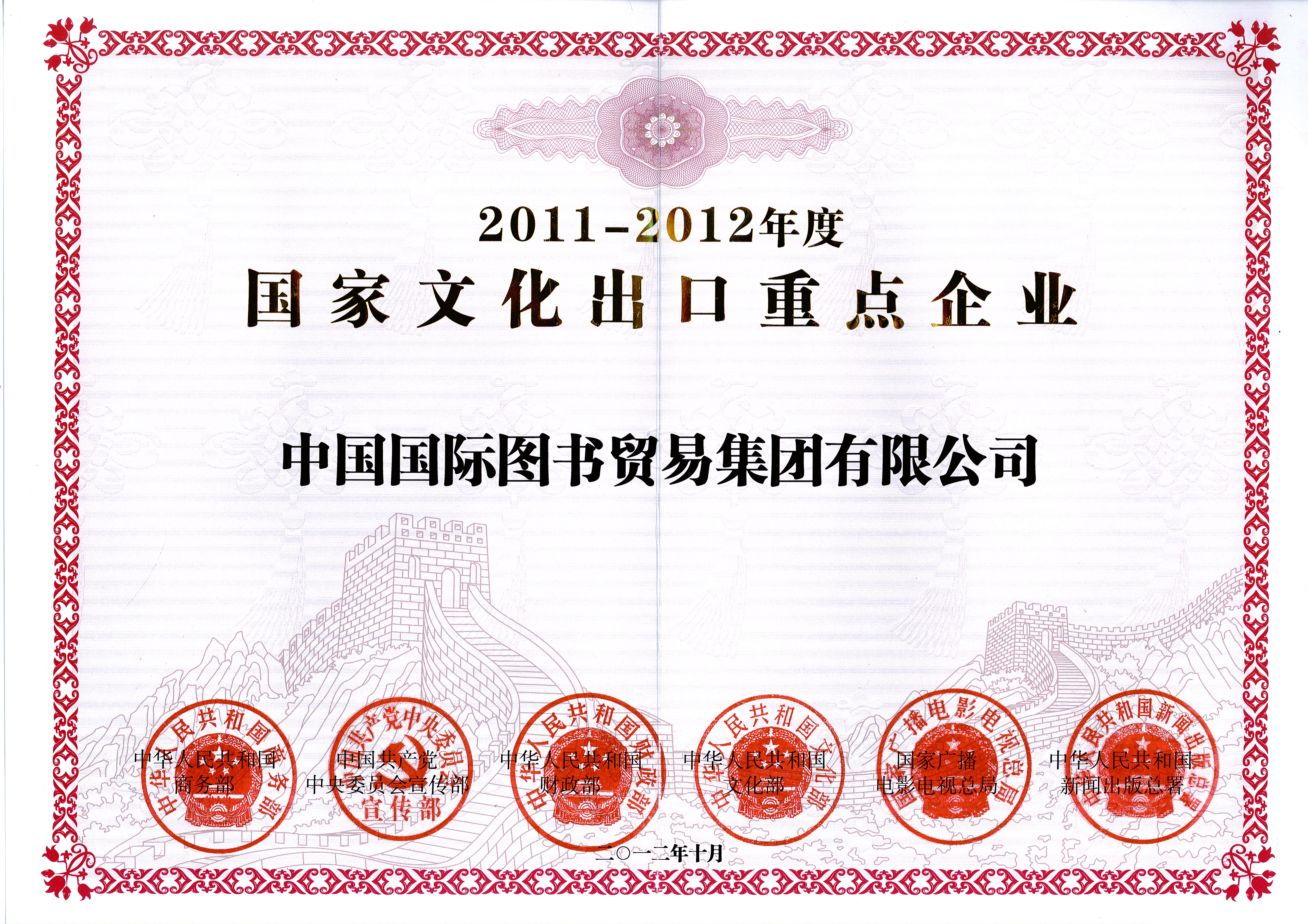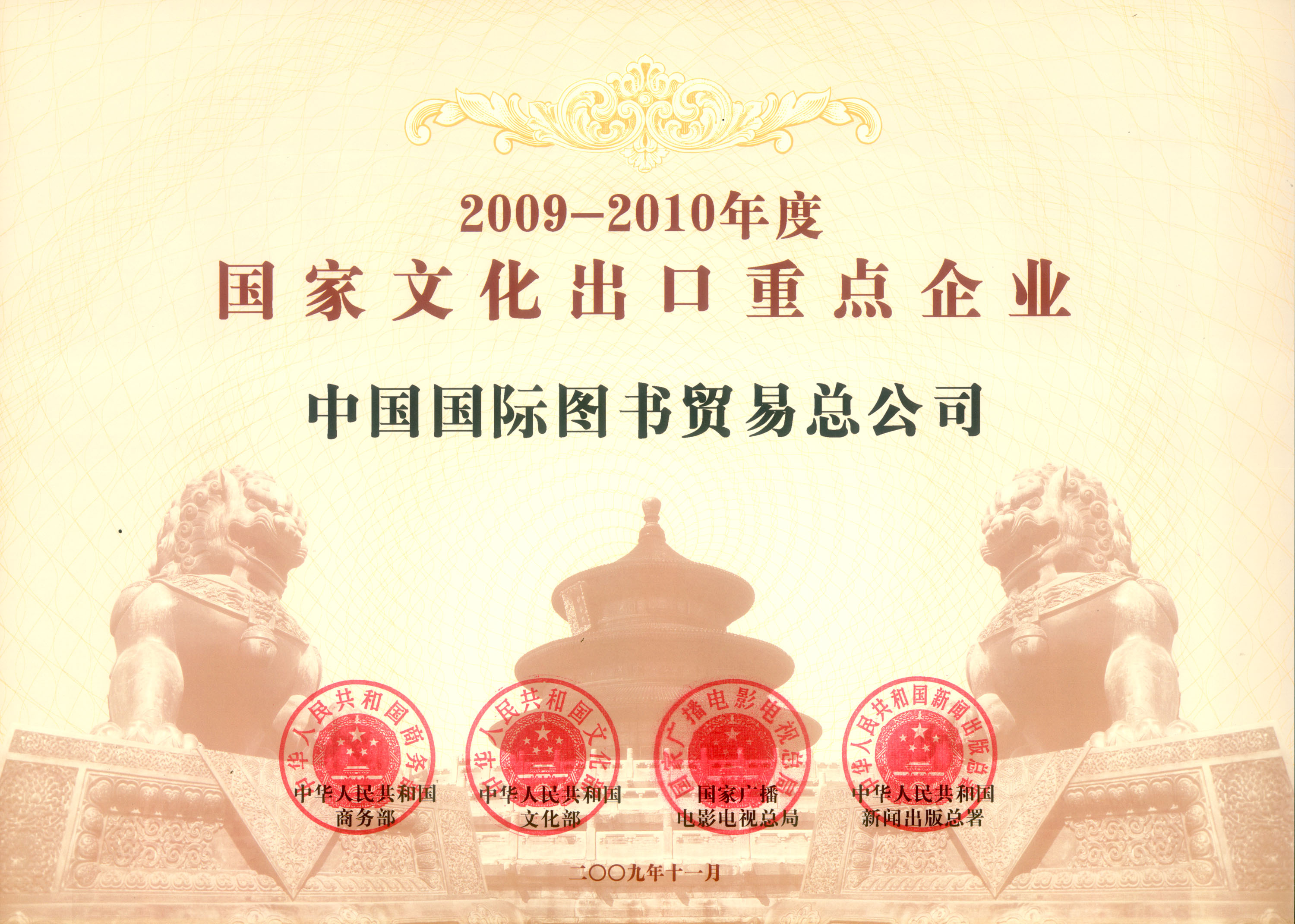 2009年11月24日,由商務部主辦、北京市人民政府協(xié)辦的第二屆中國服務貿易大會“2009-2010年度國家文化出口重點企業(yè)和重點項目授牌儀式”上,國圖總公司被商務部、文化部、廣電總局、新聞出版總署聯(lián)合授予“2009-2010年度國家文化出口重點企業(yè)”稱號。