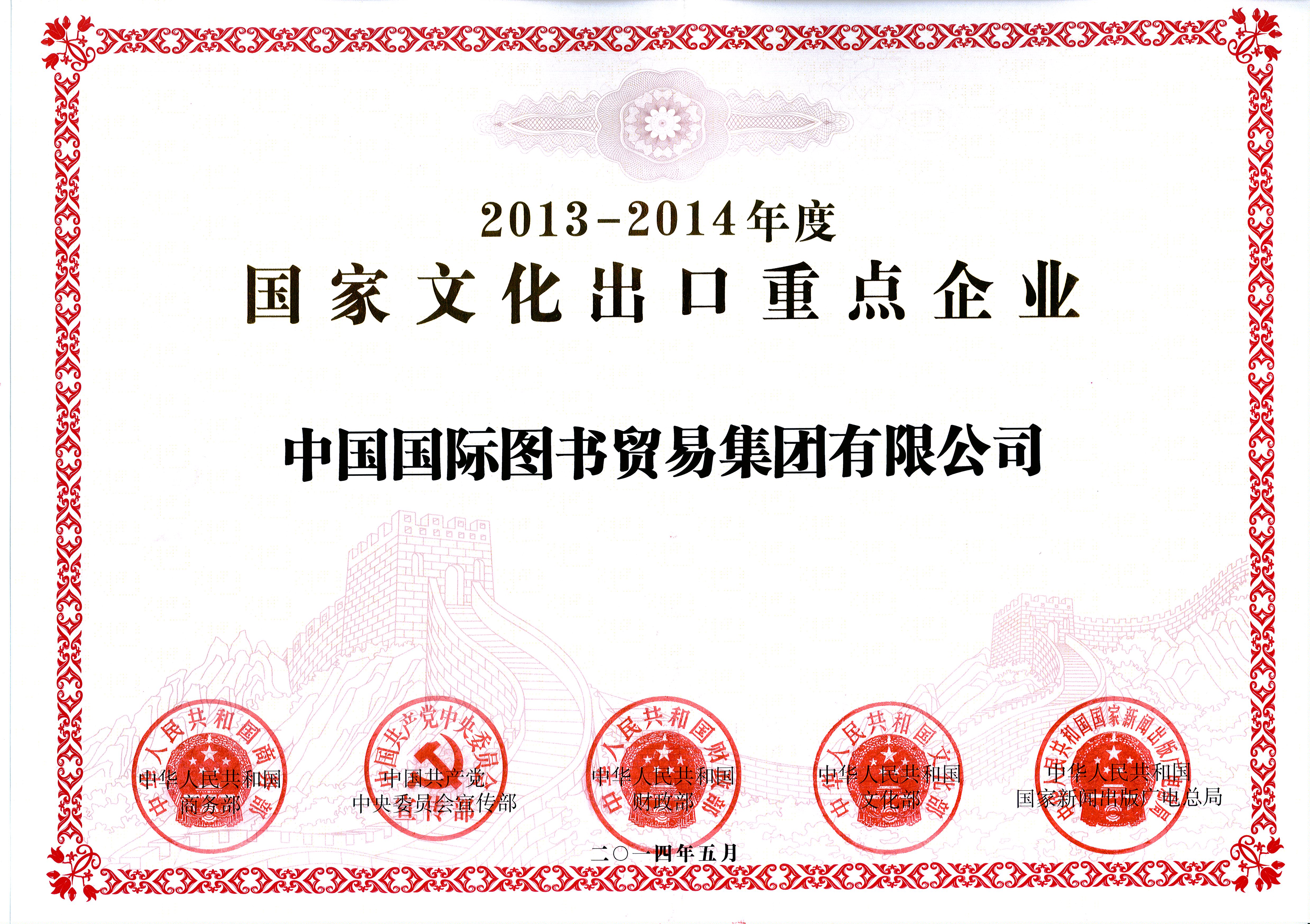2014年5月,國圖集團公司榮獲由國家商務部、中宣部、財政部、文化部、國家新聞出版廣電總局共同頒發(fā)的“2013-2014年度國家文化出口重點企業(yè)”稱號。國圖集團公司的“國圖海外華文書店營銷網(wǎng)絡計劃”、“國圖歐洲出版發(fā)行基地(倫敦中心)項目”榮獲“2013-2014年度國家文化出口重點項目”稱號。