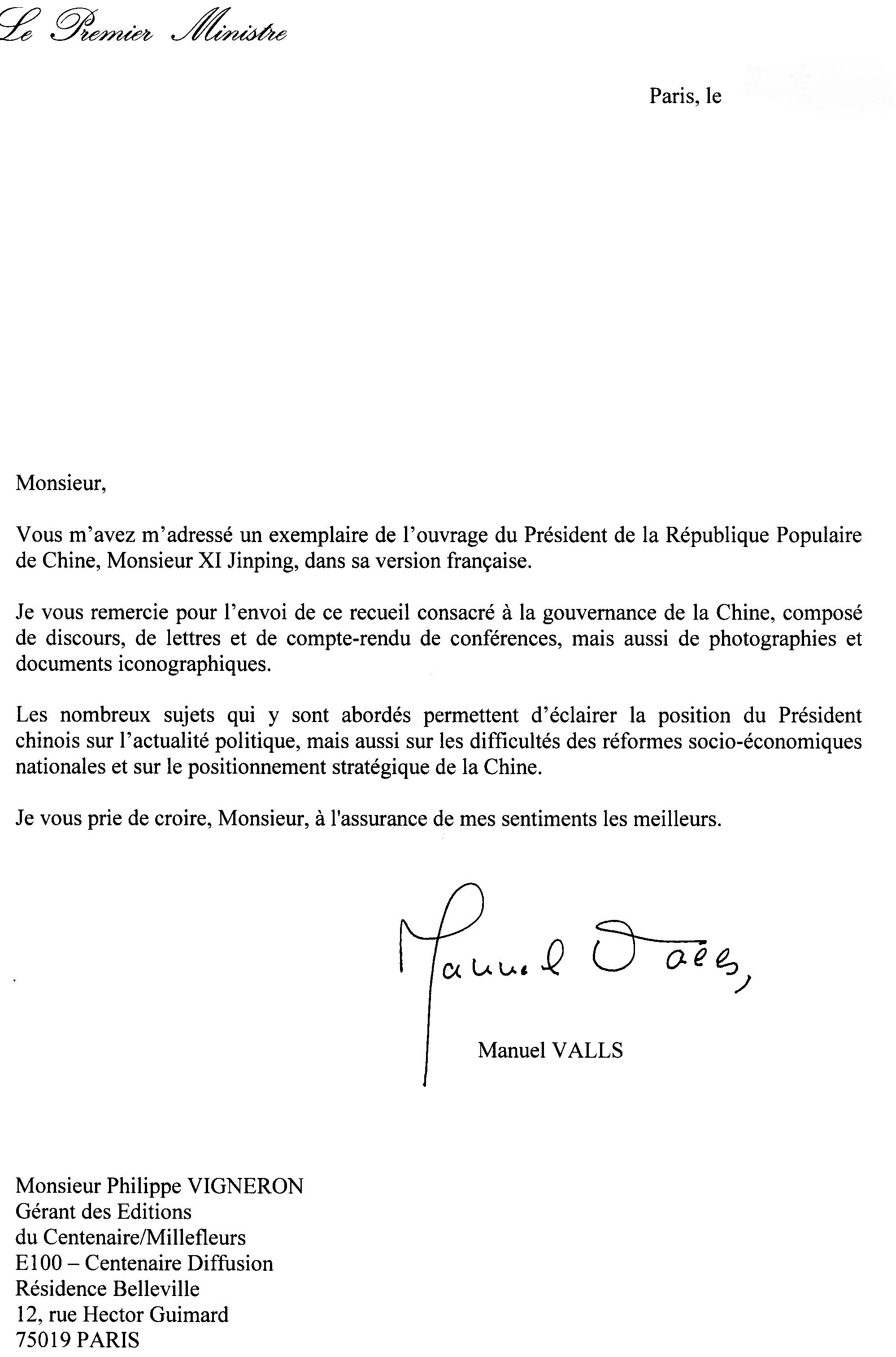 2015年5月,集團公司所屬法國百周年出版社收到了來自法國總理曼努埃爾?瓦爾斯的感謝信。信中寫到“感謝你們贈送給我由中華人民共和國主席習近平撰寫的《習近平談治國理政》一書的法文版。本書圖文并茂,囊括了關于如何治理中國的重要講話和文件。主題涉及當今中國的政治情況,國內社會經(jīng)濟體制改革及戰(zhàn)略。請接受我最誠摯的感謝。——總理曼努埃爾?瓦爾斯。”