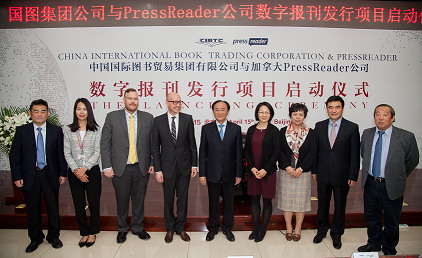 2016年4月15日,國圖集團公司和加拿大PressReader公司聯(lián)合舉辦了數(shù)字報刊發(fā)行項目啟動儀式。中國外文局副局長王剛毅、副總編輯陳實,國家新聞出版廣電總局新聞報刊司副司長趙秀玲,加拿大駐中國使館貿易專員韓穎,加拿大PressReader公司首席內容官Nikolay Malyarov、內容主管Steve Chapman,集團公司常務副總經(jīng)理賈強,副總經(jīng)理朱曉捷、夏戰(zhàn)生和外文局相關部室領導參加了啟動儀式。