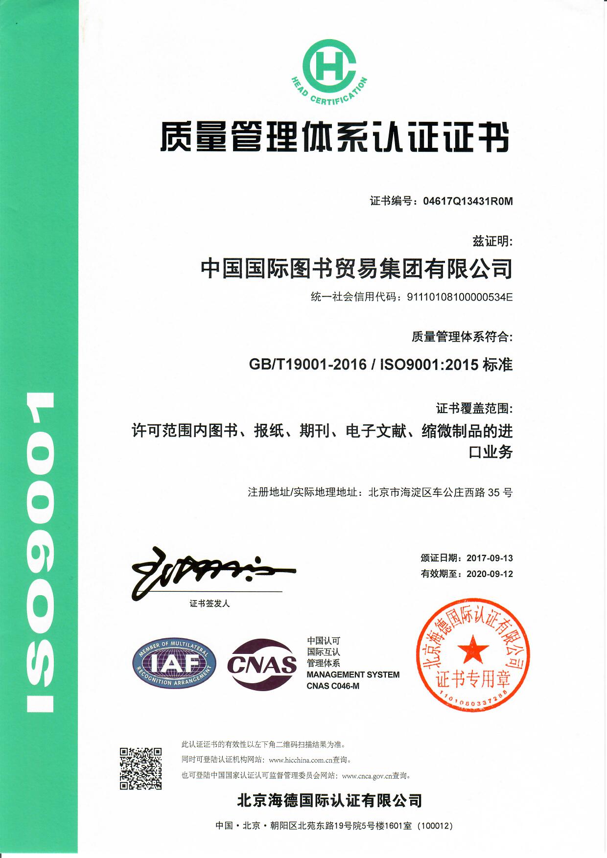 2017年9月,國圖集團公司成功獲得ISO9001國際質量標準體系認證。ISO9001質量管理體系是ISO組織(國際標準化組織)頒布的影響面最廣的一個管理體系標準,是迄今為止世界上最成熟的質量框架,不僅為質量管理體系,也為總體管理體系設立標準。國圖集團公司引入ISO9001質量管理標準,實現(xiàn)了傳統(tǒng)圖書貿易企業(yè)與國際先進管理制度、機制的對接,不僅有助于樹立現(xiàn)代管理理念,提升經(jīng)營水平,降低生產和運營成本,擴大品牌認同和市場占有率,更為集團公司實施“走出去”戰(zhàn)略,參與國際交流與競爭提供了一張質量“通行證”。